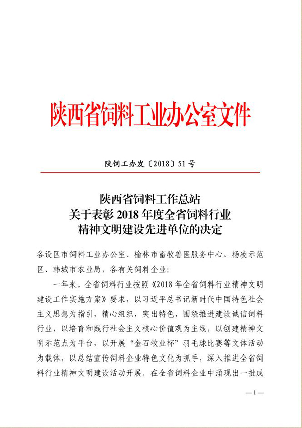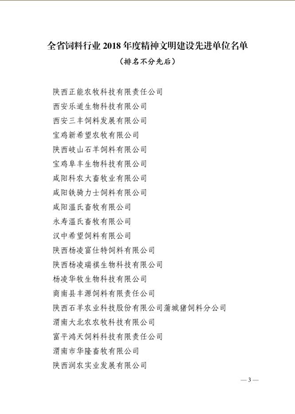 根據(jù)陜西省飼料總站《關(guān)于表彰2018年度全省飼料行業(yè)精神文明建設(shè)先進單位的通知》(陜飼工辦發(fā)【2018】51號文件)和《關(guān)于評選表彰2018年度全省飼料行業(yè)“誠信農(nóng)企”的通知》(陜飼工辦發(fā)【2018】40號文件),經(jīng)飼料企業(yè)自愿申請,各市飼料管理部門初審?fù)扑],結(jié)合對各申報和推薦的單位全年精神文明建設(shè)工作開展情況進行綜合評定,最終包括陜西楊凌瑞祺生物科技有限公司在內(nèi)的20家單位獲得2018年度全省飼料行業(yè)精神文明建設(shè)“先進單位”榮譽稱號,26家飼料企業(yè)獲得2018年度全省飼料行業(yè)“誠信農(nóng)企”榮譽稱號。
