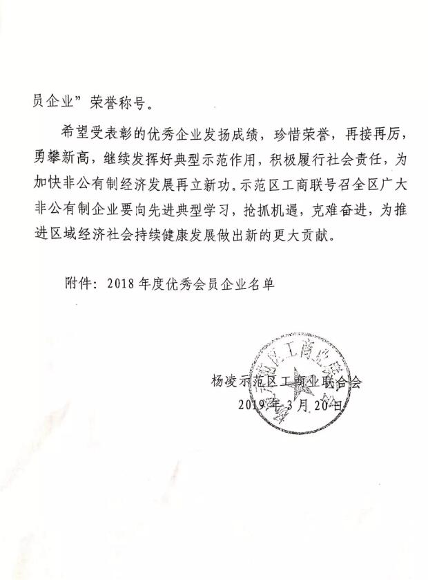 2018年,陜西楊凌瑞祺生物科技有限公司在楊凌示范區(qū)工商聯(lián)合會的精心指導(dǎo)下,在黨工委、管委會的堅強領(lǐng)導(dǎo)下,認(rèn)真學(xué)習(xí)貫徹習(xí)近平新時代中國特色社會主義思想和黨的十九大精神,緊緊圍繞“兩個健康”工作主題,務(wù)實創(chuàng)新,開拓進(jìn)取,為全區(qū)經(jīng)濟(jì)社會發(fā)展做出了積極貢獻(xiàn)。2019年3月我公司被楊凌示范區(qū)工商業(yè) 聯(lián)合會授予“2018年度優(yōu)秀會員企業(yè)”榮譽。